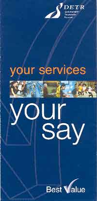 Leták vydaný centrálním oddělením pro životní prostředí, dopravu a regióny, ve spolupráci s rozvojovou agenturou a Asociací místních vlád. Od čištění ulic ke školství, od bydlení k sociální pomoci a od parkování k parkům jsou místní radnice srdcem komunity, poskytující nezbytné služby, na které se všichni spoléháme. Většina místních radnic tvrdě pracuje, aby své služby zlepšila. Na pomoc a podporu přináší vláda Best Value. Vaše služby, Vaše slovo - leták (Birmingham)